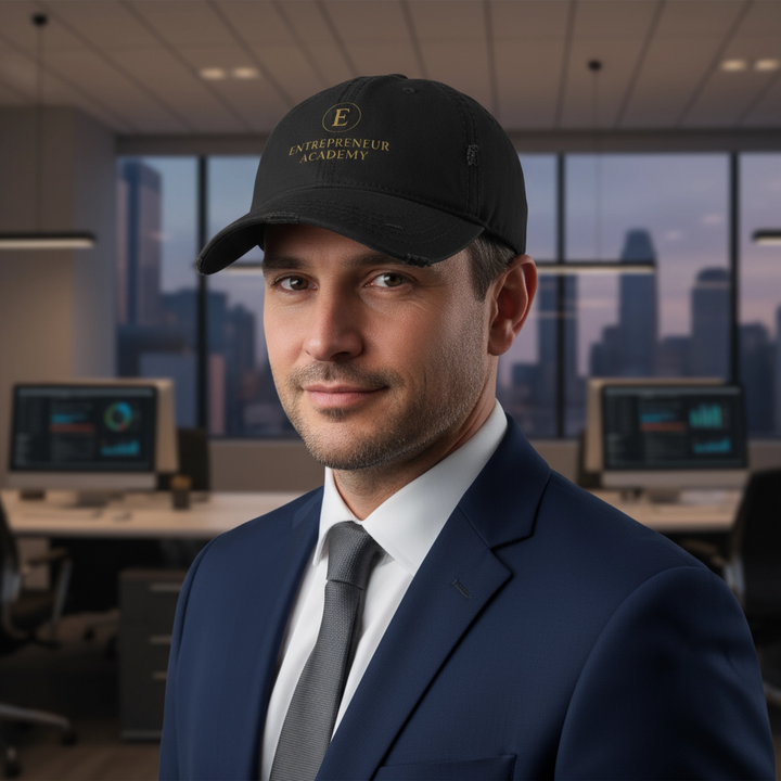 Join the ranks of the ambitious with the official Entrepreneur Academy Distressed Dad Hat. This isn't just headwear; it's a statement for the hustlers, the innovators, and the future CEOs. The premium gold embroidery shines against the classic black cotton, representing the high value of your goals and the success you strive for.