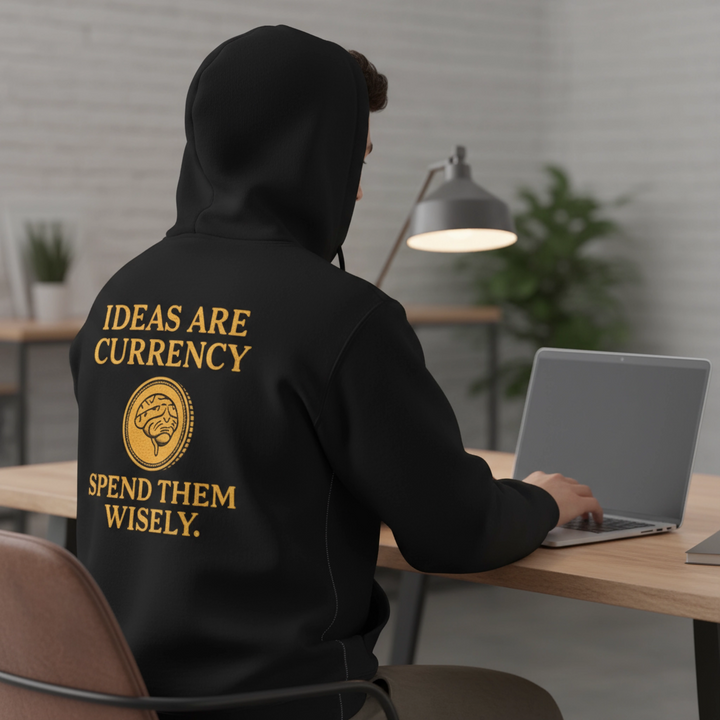 Unlock the power of your mind with our "Ideas Are Currency" hoodie. This isn't just a piece of clothing; it's a statement for the modern thinker, innovator, and creator. The powerful message, "Ideas Are Currency, Spend Them Wisely," is paired with a unique brain-coin graphic, serving as a daily reminder that your thoughts and creativity are your most valuable assets.