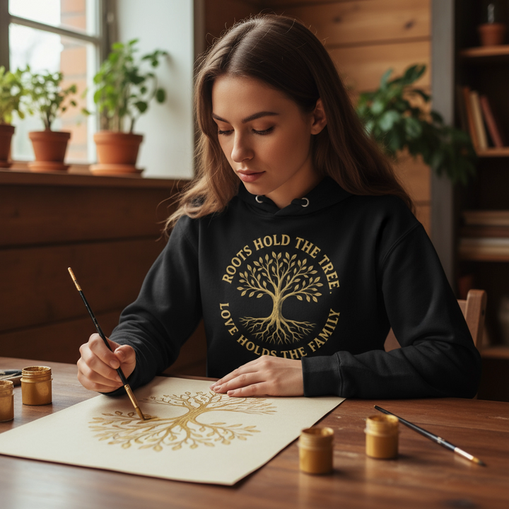 Celebrate the unbreakable bonds of family with this meaningful Tree of Life hoodie featuring the profound message "Roots Hold the Tree, Love Holds the Family." This design captures the timeless symbolism of the tree of life, where deep roots represent your ancestors and heritage, while the expansive branches symbolize family growth across generations. The golden tree illustration with its intricate root system serves as a beautiful metaphor for family strength, unity, and the interconnected network that binds loved ones together.