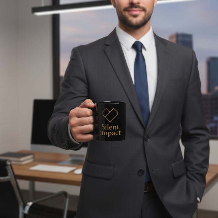 Make a statement without saying a word with our "Silent Impact" ceramic mug. This cupboard essential is more than just a vessel for your favorite beverage; it's a tribute to those who lead with quiet confidence and whose actions create powerful ripples. The elegant gold "Silent Impact" text is paired with a modern, geometric heart, creating a striking contrast against the sleek, glossy black finish.